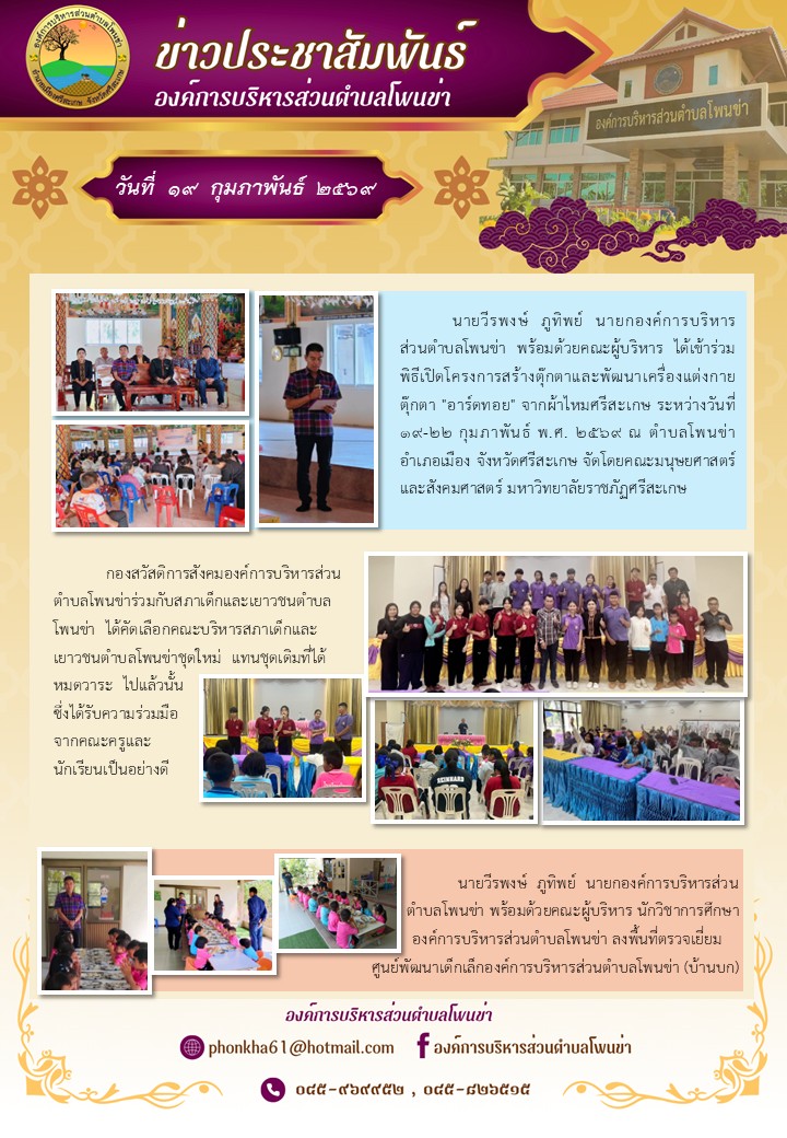 วันที่ ๑๗ ธันวาคม ๒๕๖๗ เวลา ๐๙.๐๐ น. กองสวัสดิการสังคมองค์การบริหารส่วนตำบลโพนข่าร่วมกับสภาเด็กและเยาวชนตำบลโพนข่า ได้คัดเลือกคณะกรรมการสภาเด็กและเยาวชนชุดใหม่ แทนชุดเดิมที่ครบวาระและจับฉลากออกกึ่งหนึ่ง พร้อมประชุมสามัญประจำปีของสภาเด็กและเยาวชนตำบลโพนข่า |